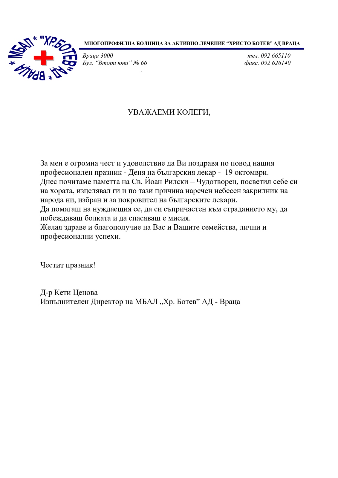 За мен е огромна чест и удоволствие да Ви поздравя по повод нашия професионален празник - Деня на българския лекар - 19 октомври.