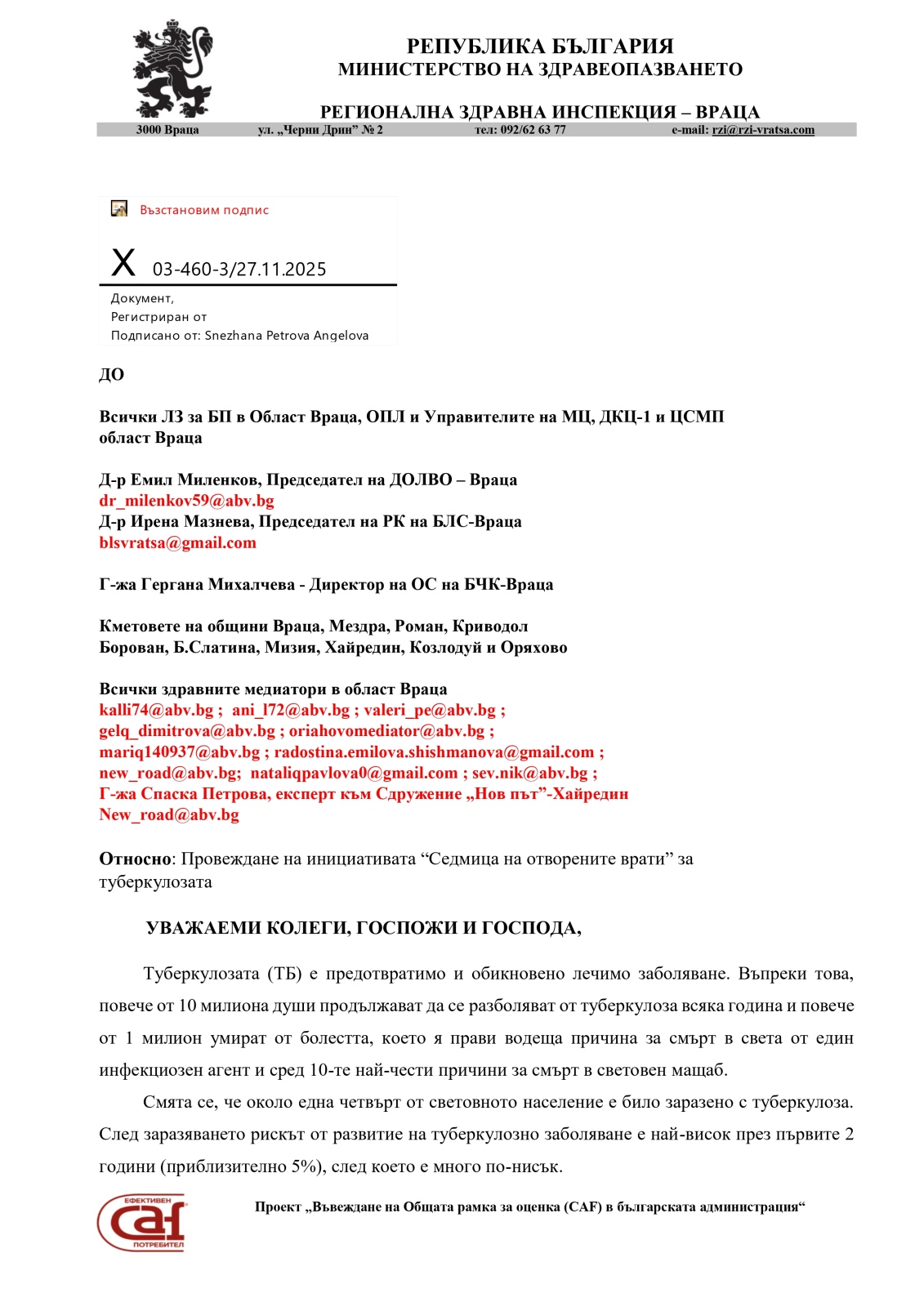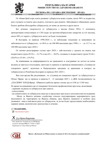 Във тази връзка Ви уведомяваме , че „Седмица на отворените врати“ за тубрекулозата в